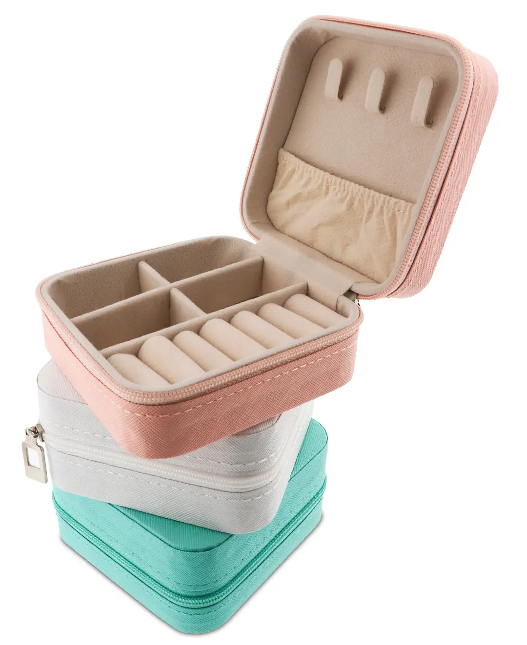 Organizador compacto y resistente, ideal para guardar anillos, aros y cadenas sin que se enreden. Interior suave que protege las joyas y cierre perimetral seguro.